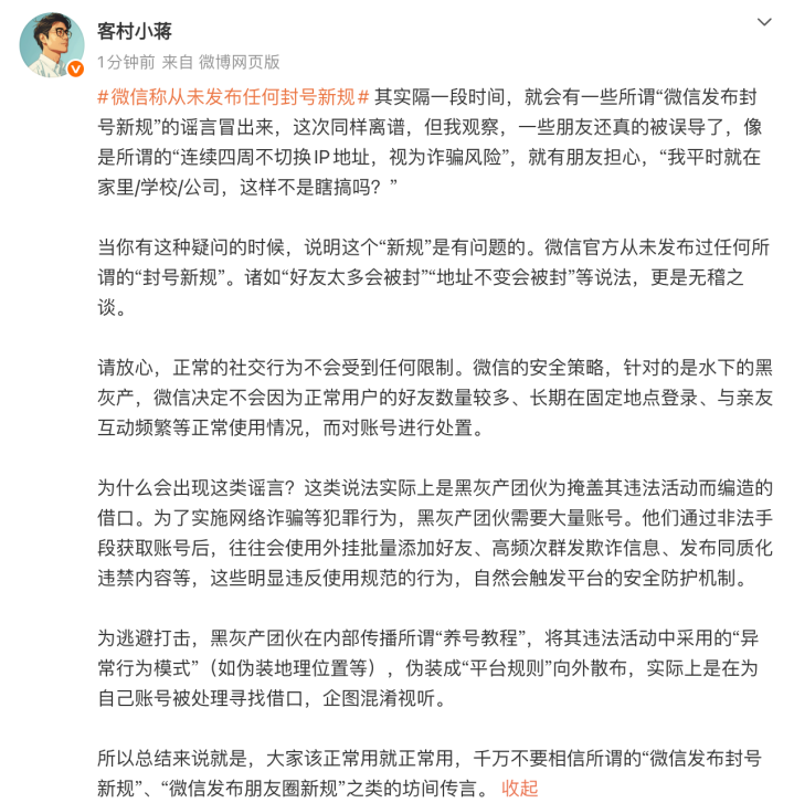 “客村小蒋”进一步表示,正常的社交行为不会受到任何限制。微信的安全策略,针对的是水下的黑灰产,微信不会因为正常用户的好友数量较多、长期在固定地点登录、与亲友互动频繁等正常使用情况,而对账号进行处置。