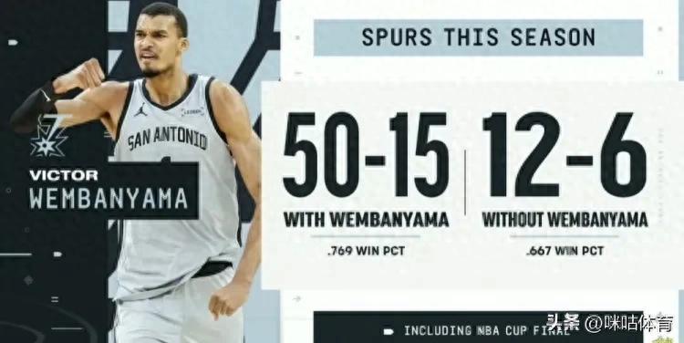 文班亚马对于马刺的重要性不言而喻。据统计,本赛季常规赛中文班亚马出战时,马刺战绩为50胜15负,胜率高达76.9%;而在他缺席的情况下,马刺战绩为12胜6负,胜率降至66.7%。尽管缺席时胜率依然不低,但文班亚马在攻防两端的威慑力和战术核心作用无可替代。