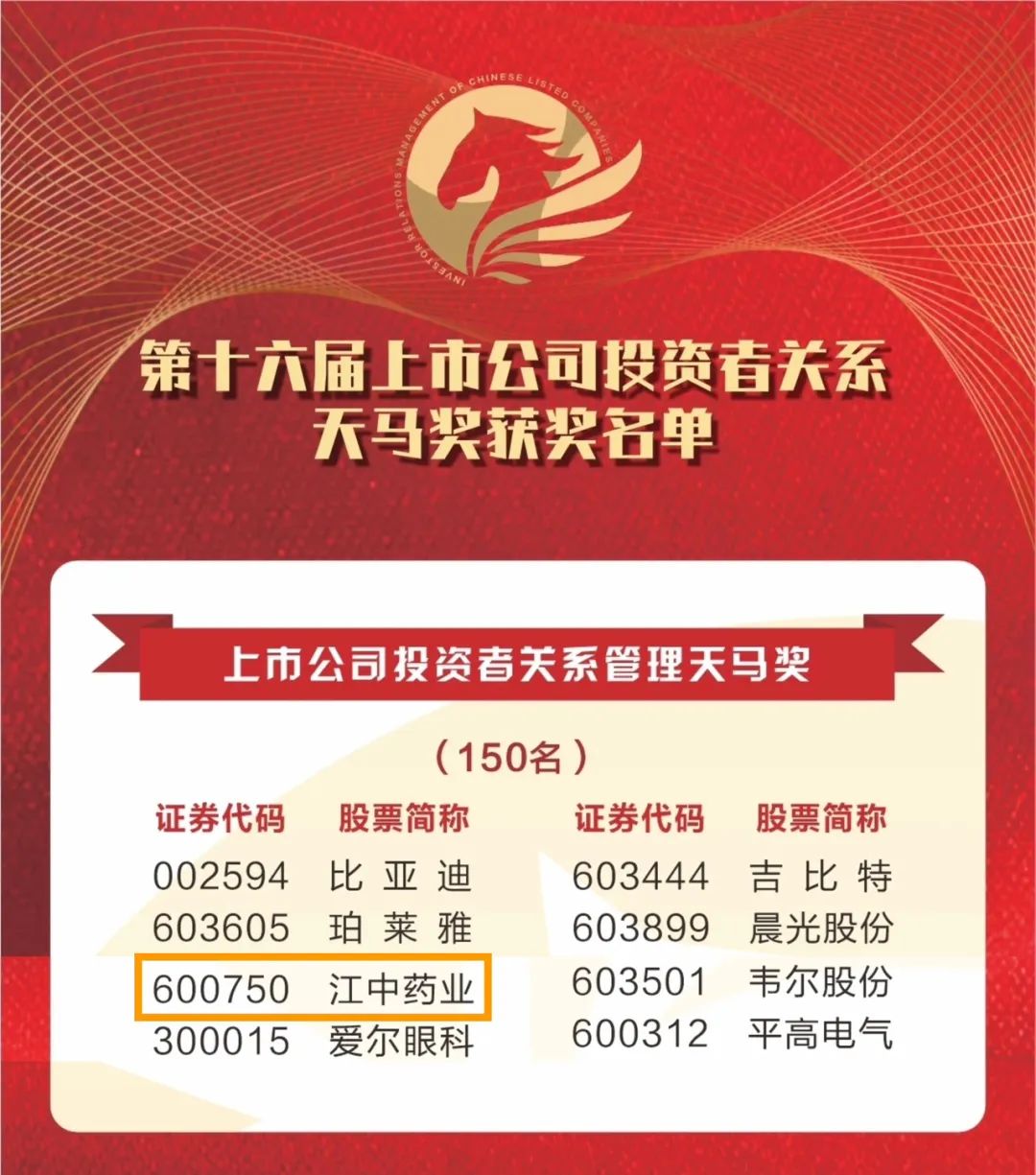 近日,江中药业(600750)在投资者关系管理领域连获殊荣,入选中国上市公司协会“2024年度上市公司投资者关系管理最佳实践”,并获得证券时报第十六届天马奖“中国上市公司投资者关系管理天马奖”。公司董事会秘书同时获评“上市公司投资者关系管理杰出董秘奖”。